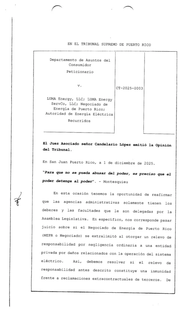 El Tribunal Supremo de Puerto Rico falló de forma unánime a favor del Departamento de Asuntos del Consumidor (DACO) en el caso contra LUMA Energy, al concluir que fue inconstitucional la decisión del Negociado de Energía (NEPR) que eximía al consorcio de responsabilidad por daños a enseres eléctricos ocasionados por bajones y fallas en el servicio.